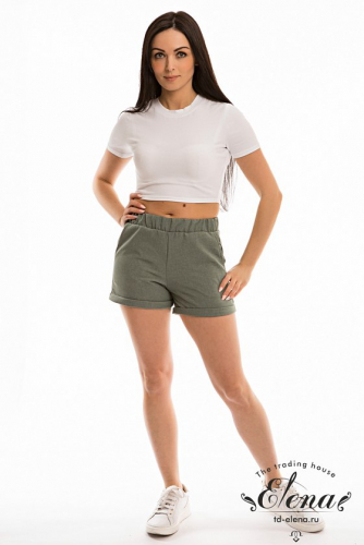 Шорты выполнены из искусственного льняного полотна. Пояс с резиной внутри. В боковых швах имеются карманы. Снизу шорты оформлены отворотами. Полиэстер 100%